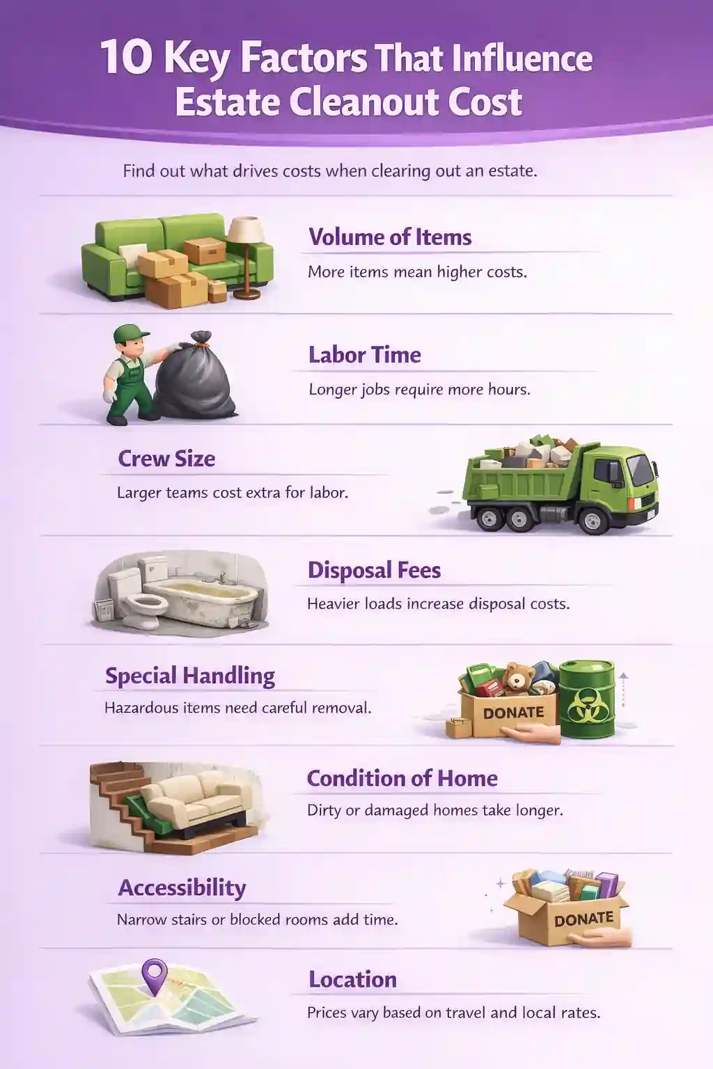 This page breaks down the 10 key factors that influence estate cleanout cost, so you can understand what actually drives pricing, spot hidden cost triggers before you request quotes, and make a confident decision without surprise fees.